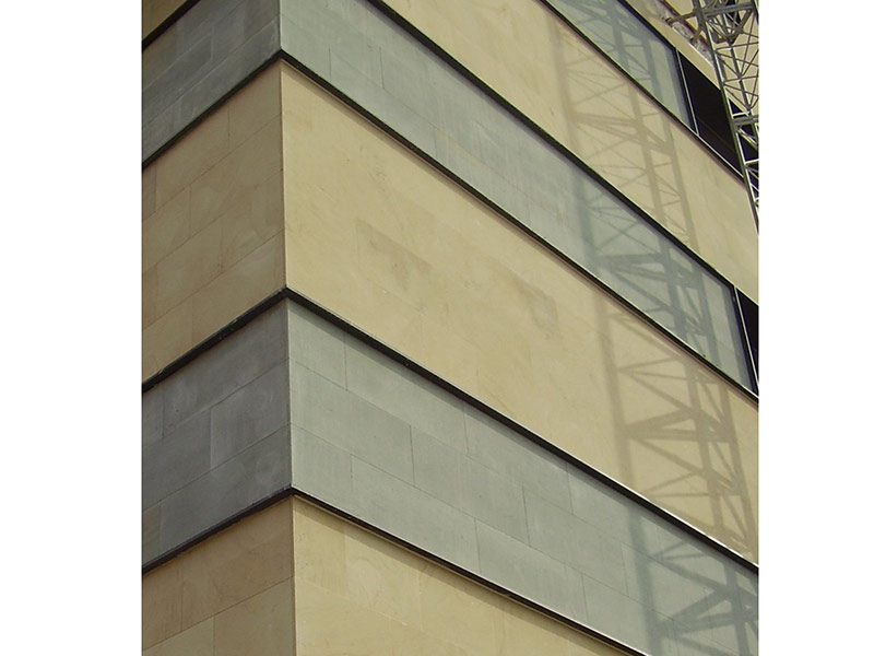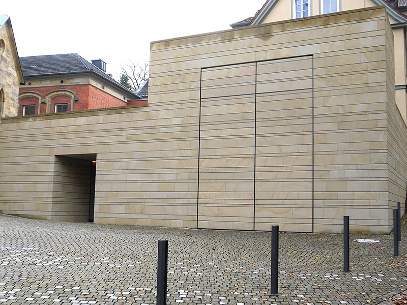 Alternativ hierzu das vorgesetzte hinterlüftete Natursteinmauerwerk auf Tragkonsolen und mit Halteankern.